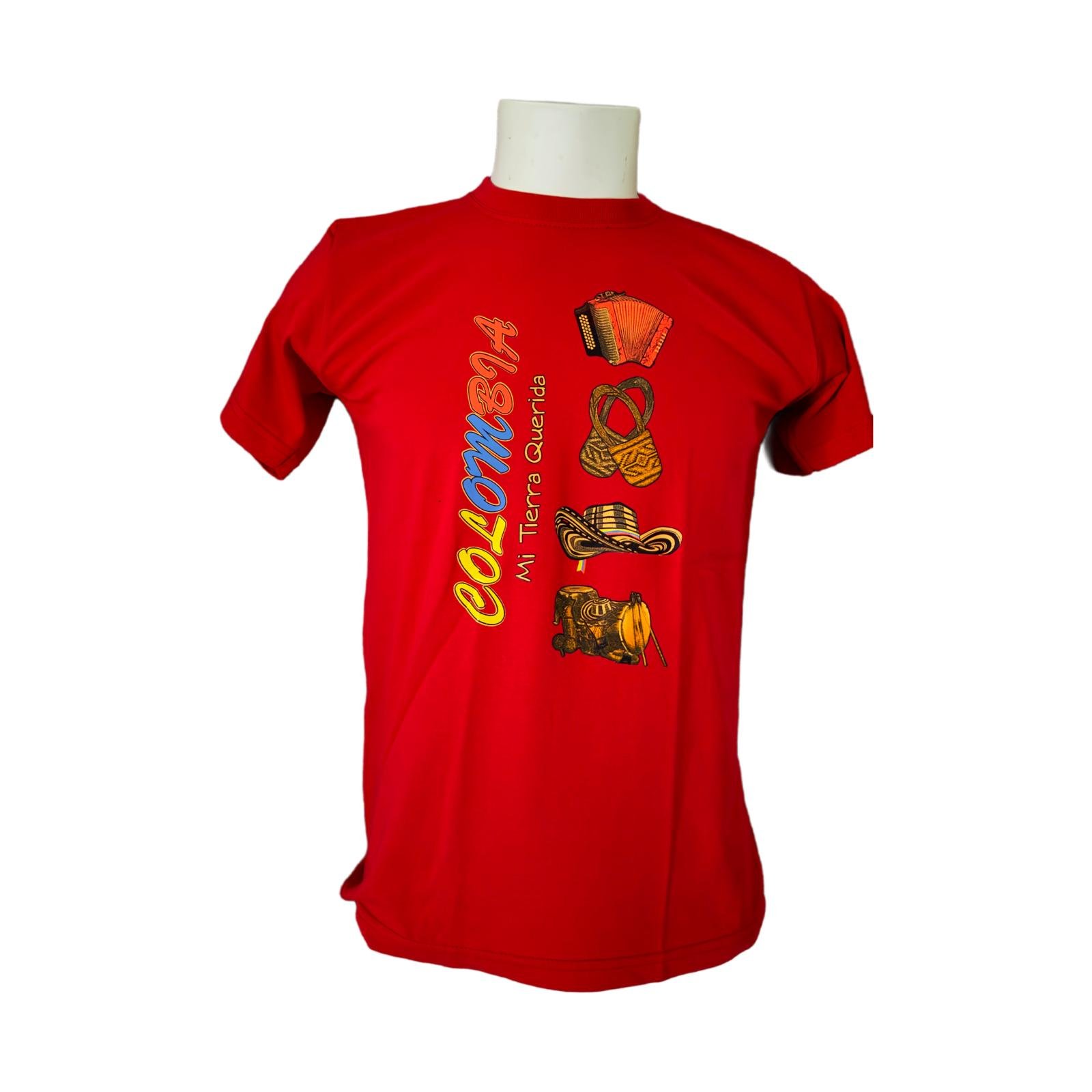 This vibrant red t-shirt celebrates the spirit of Colombia with a vertical design showcasing iconic symbols like the accordion, traditional sandals (alpargatas), the sombrero vueltiao, and the classic Colombian chiva bus. Featuring the phrase “Colombia – Mi Tierra Querida,” it’s a garment full of cultural pride—perfect for those who want to carry their roots wherever they go. Colorful, authentic, and full of tradition.